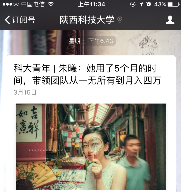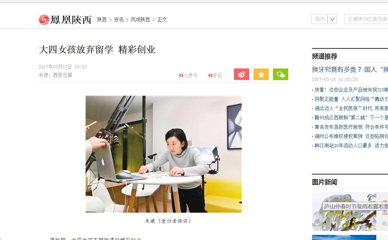 3月15日,一篇《科大青年 | 朱曦:她用了5个月的时间,带领团队从一无所有到月入四万》的深度报道在我校官微发出后,迅速引起了众多媒体的关注。朱曦,这位我校大四女孩的精彩创业故事先后被西安日报、网易、凤凰网等报道或转载,陕西省教育厅微博也推送了一条关于朱曦创业团队的“从0开始,向1迈进”的微博。