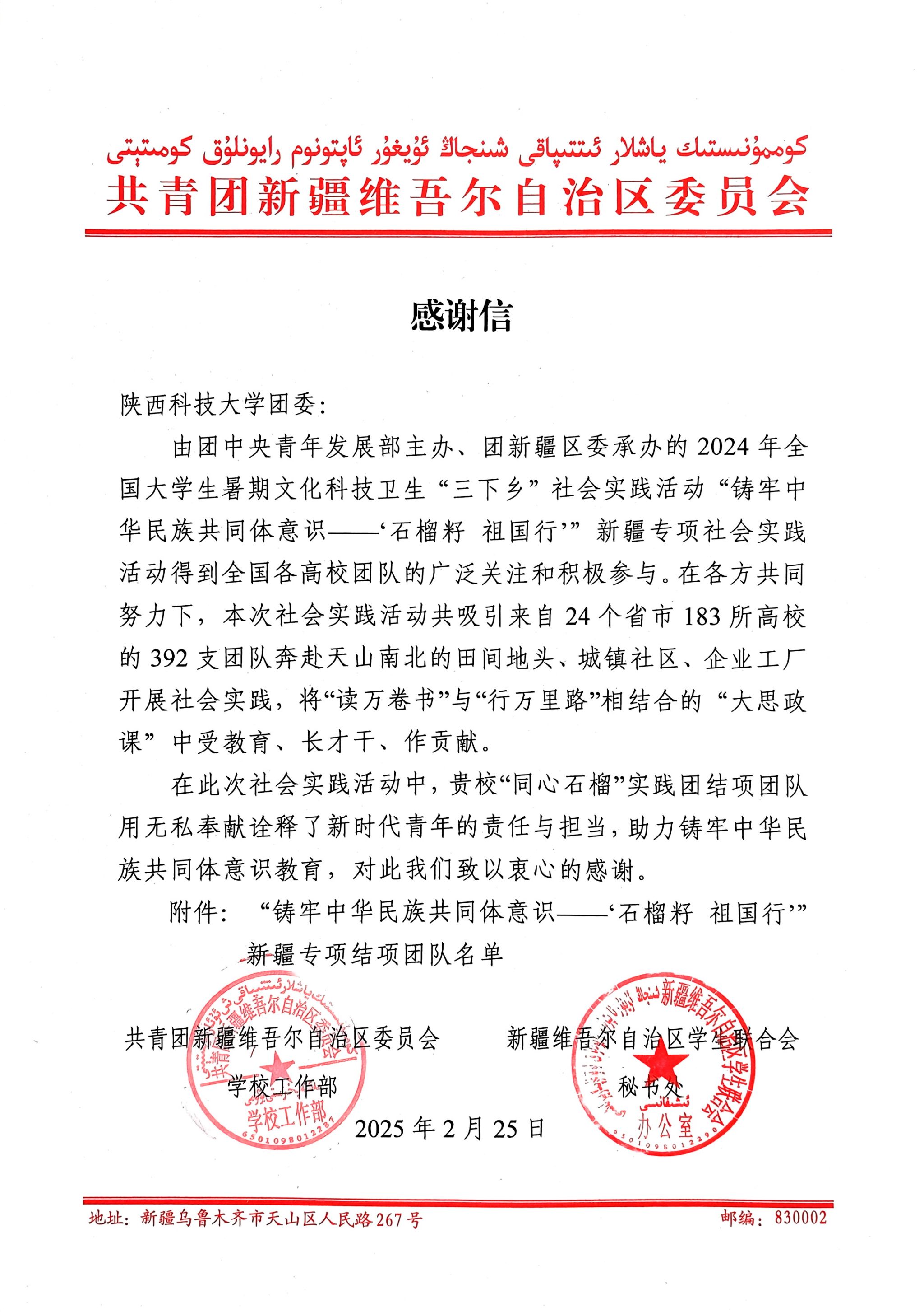 此次新疆维吾尔自治区团委的来信表扬,不仅是对“同心・石榴”实践团工作的高度认可,更是对我校社会实践工作的充分肯定。我校将以此为契机,持续鼓励更多学子积极参与社会实践,为推动民族团结进步事业贡献更多力量。