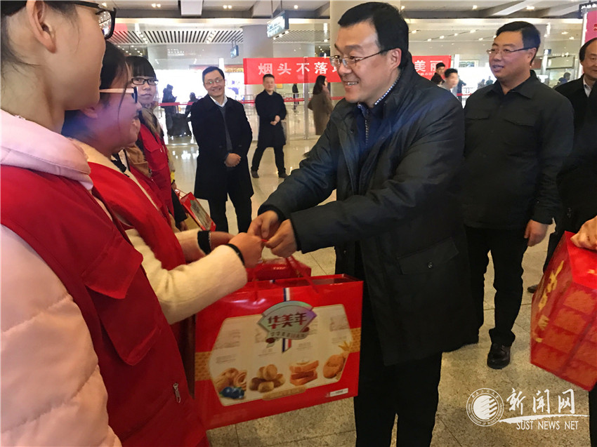 1月26日下午,在农历春节即将来临之际,共青团陕西省委书记段小龙,团省委党组成员、省少先队总辅导员赵大胜等一行来到西安北客站慰问我校60名春节期间坚守在春运志愿服务工作第一线的大学生志愿者,并向他们送去慰问品和新春的祝福。