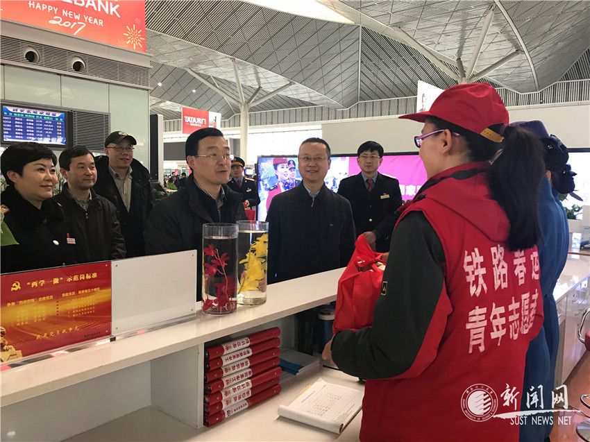段小龙一行先后来到地铁北客站售票处、列车站台,高铁北客站候车大厅、咨询服务台、重点旅客爱心服务区、“志愿者之家”等处,逐一走访了坚守在各个岗位上的志愿者,详细询问志愿服务内容、服务中遇到的困难以及体会和感受,他还与志愿者们互道新年祝福并发放慰问品。段小龙对我校大学生志愿者牺牲节假日时间参加春运志愿服务表示感谢,并对志愿者们表现出的志愿精神和服务水平给予高度评价。他指出,青年志愿者主动放弃休假参加春运志愿服务体验春运、适应社会,为广大乘客与春运工作架起良好了的沟通桥梁,用自己的服务向社会展示了大学生的风采,用“奉献、互助、友爱、进步”的志愿者精神温暖了旅客的回家路。