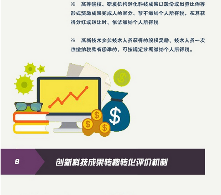 八、加大科技成果转移转化财税支持力度。高等院校、研发机构转化科技成果以股份或出资比例等形式奖励成果完成人的部分,暂不缴纳个人所得税,在其获得分红或转让时,依法缴纳个人所得税;高新技术企业技术人员获得的股权奖励,技术人员一次性缴纳税款有困难的,可按规定分期缴纳个人所得税。