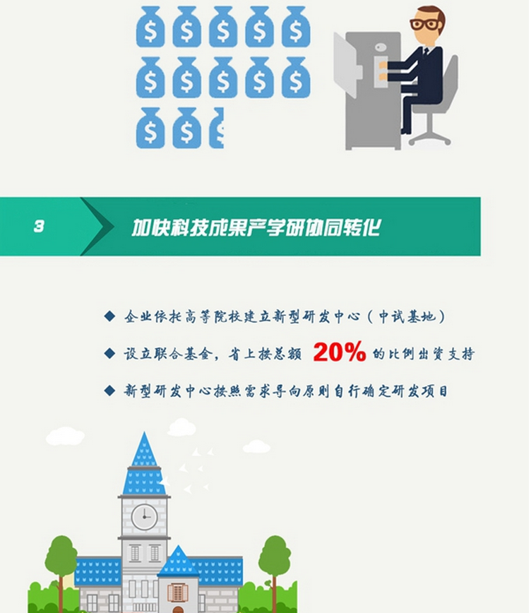 三、加快科技成果产学研协同转化。支持企业依托高等院校建立产学研深度融合的新型研发中心(中试基地),设立联合基金,省上按总额20%的比例出资支持,新型研发中心(中试基地)按照需求导向原则自行确定研发项目。对获得国家科技奖励的重大成果进行转化的,给予省级科技计划立项支持 。