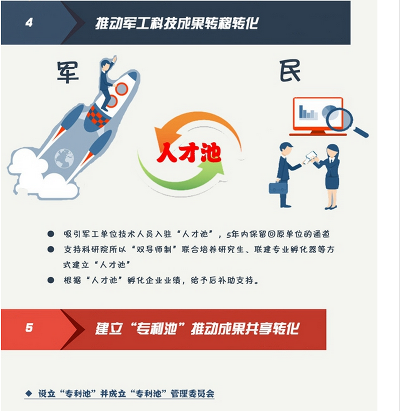 四、推动军工科技成果转移转化。建立军民人才双向流动“人才池”,促进企业孵化。吸引军工单位技术人员入驻“人才池”,5年内保留回原单位的通道。支持科研院所特别是涉军科研院所与地方高等院校以“双导师制”联合培养研究生、联建专业孵化器等方式建立“人才池”。根据“人才池”孵化企业业绩,给予后补助支持。
