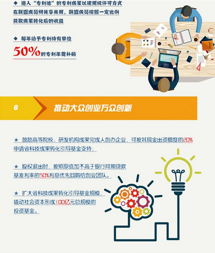 六、推动大众创业万众创新。鼓励高等院校、研发机构成果完成人创办企业,可按其现金出资额度的20%申请省科技成果转化引导基金支持;股权退出时,按照原值加不高于银行同期贷款基准利率的50%利息优先回购给创业团队。扩大省科技成果转化引导基金规模,撬动社会资本形成100亿元总规模的投资基金。对符合条件的科技型中小企业贷款给予风险补偿,对于创业投资机构投资种子期、初创期科技型企业发生的实际投资损失,可按照损失额的一定比例给予风险救助。