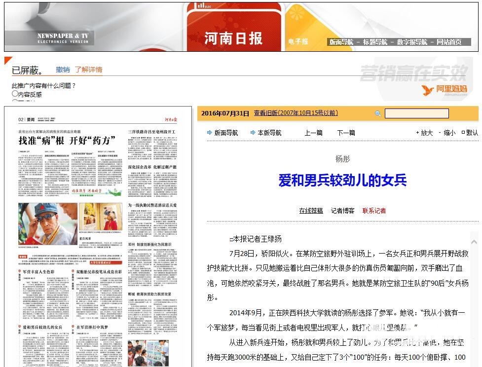 2016年7月31日,河南日报、新华网、凤凰财经等多家媒体以《爱和男兵较劲儿的女兵》为题对杨彤进行采访报道。