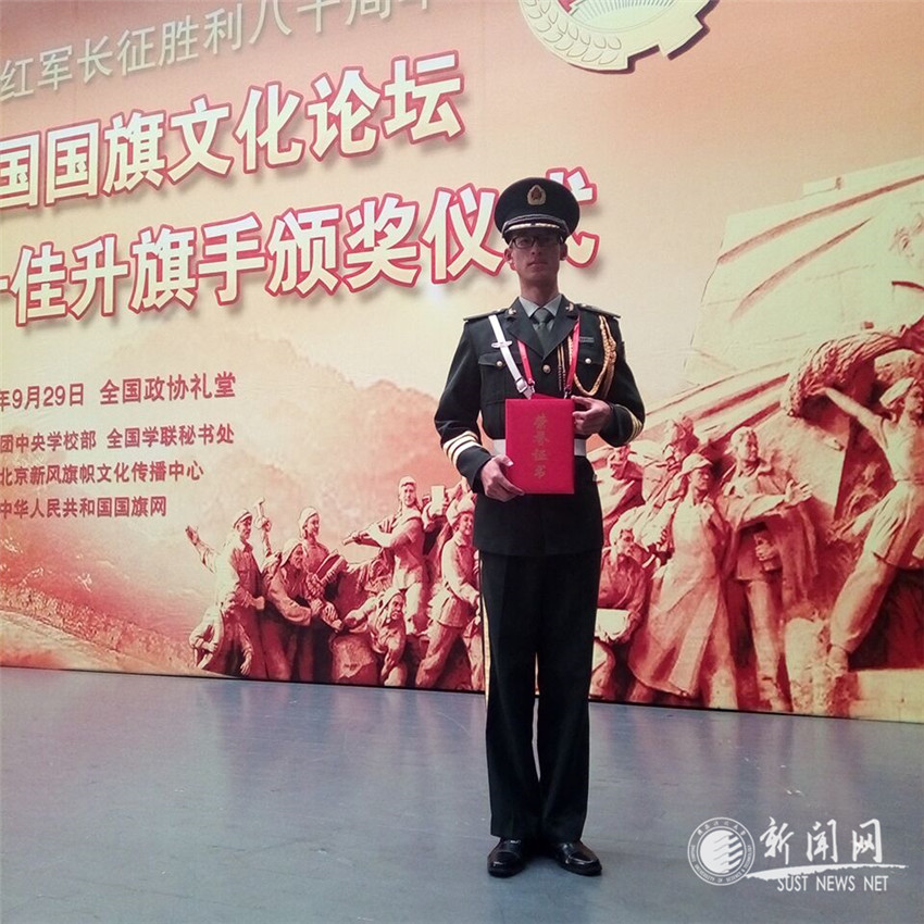 9月27日至10月2日,在全国政协礼堂举行了由共青团中央学校部和全国学联秘书处联合主办的“青春旗帜——向祖国致敬”全国高校十佳升旗手评选暨全国高校升旗手交流展示活动。活动旨在向社会推广国旗文化教育。北京各界代表和全国27所高校师生共计四百多人出席了此次活动。来自于我校国旗护卫队的吉鹏博同学荣获全国“高校十佳升旗手”荣誉称号。