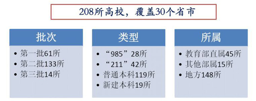 针对这一现状,我国从2008级大学生起试点实施“卓越工程师教育培养计划”,2010年起正式实施。至今,从首批61所试点高校、到第二批133所、再到第三批14所,已覆盖30个省份208所高校。其中,985院校28所、211院校42所、普通本科院校119所、新建本科院校19所。