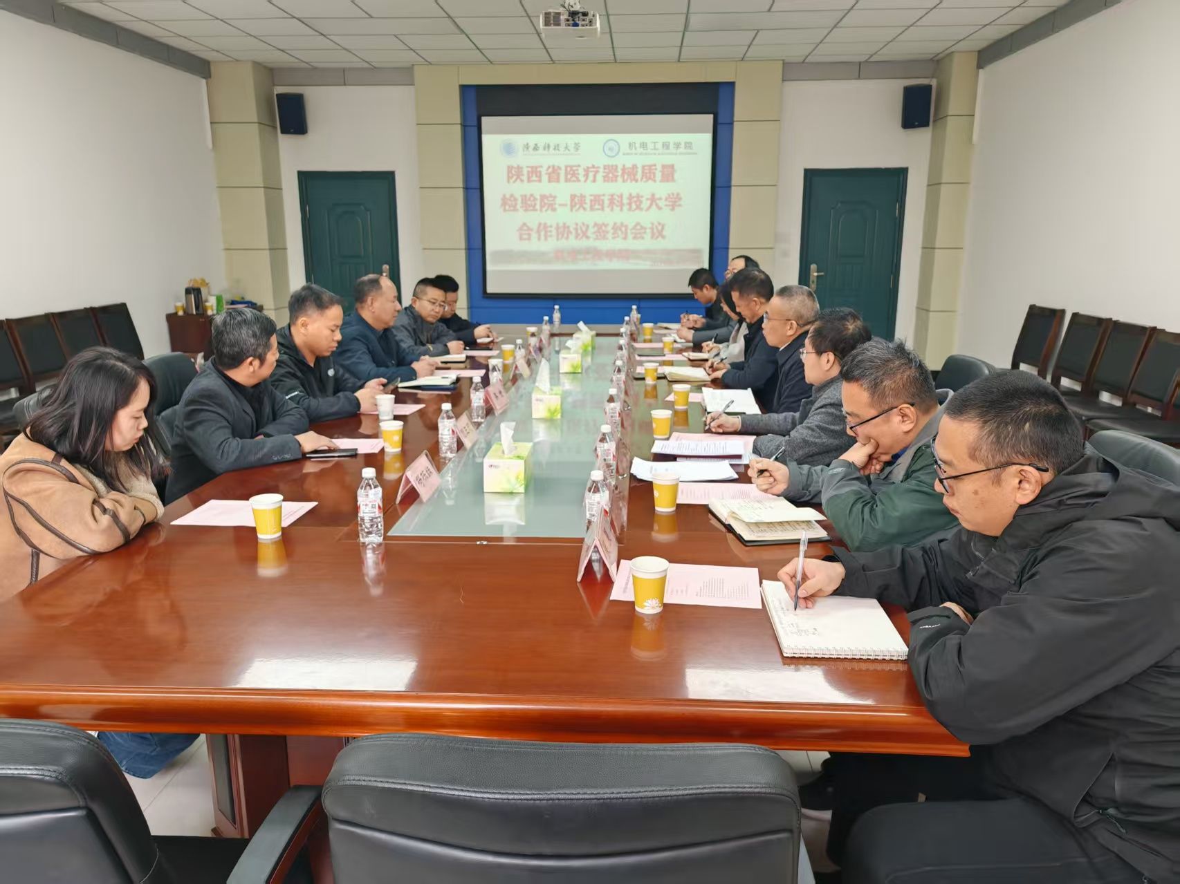 3 月 28 日, 陕西省医疗器械质量检验院副院长陈书伏、有源检验所所长王晓东一行七人回访机电工程学院(智能制造与机器人工程学院),开展产教融合交流,双方签署合作协议。机电学院党委书记夏祥林、院长杨立军、赵雪妮教授及智能科学系副主任等参加了交流和签约仪式,会议由机电学院副院长李晨主持。