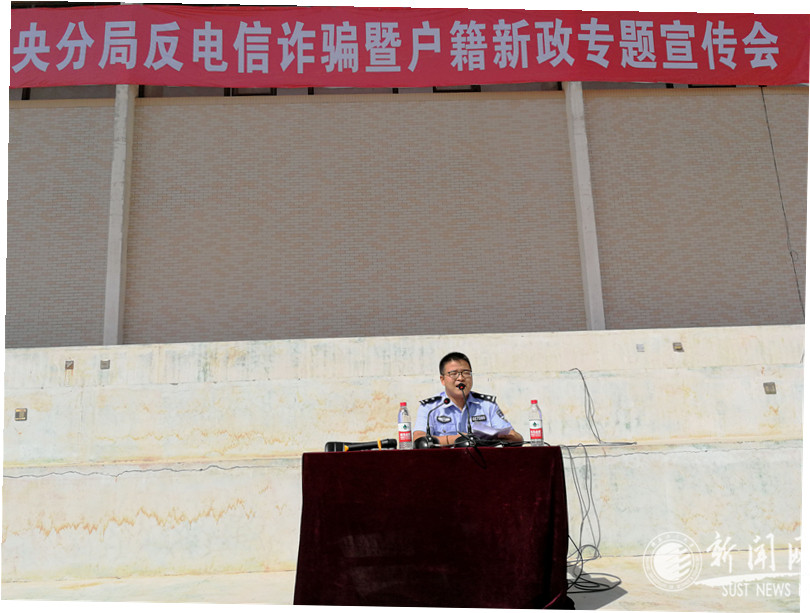 为使新生迅速适应大学生活,提高安全意识,结合军训期间的安全教育、适应教育安排,9月11日上午,学工部、保卫处共同邀请公安局未央区分局部分警官,在田径运动场举办了“公安未央分局反电信诈骗暨户籍新政”专题宣传会。2017级全体新生和辅导员参加了此次宣传会。
