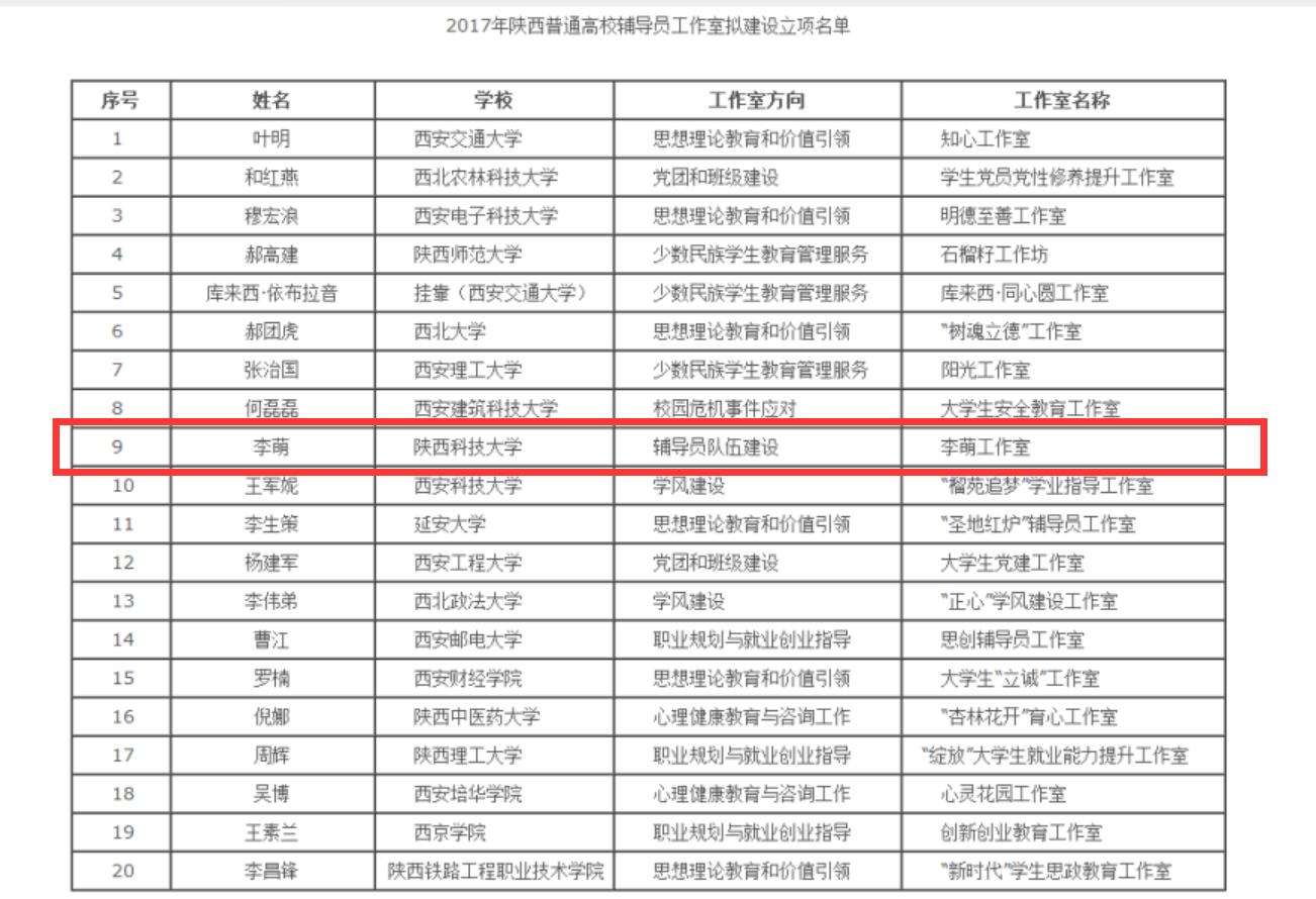 经高校推荐、材料审核和答辩评审等环节,陕西普通高校首批辅导员工作室立项名单公布,我校“李萌工作室”入选。该工作室是全省首批高校立项建设的20个工作室中唯一以“辅导员队伍建设”为研究方向的工作室,同时也是入选工作室中仅有的以主持人姓名命名的两个工作室之一。