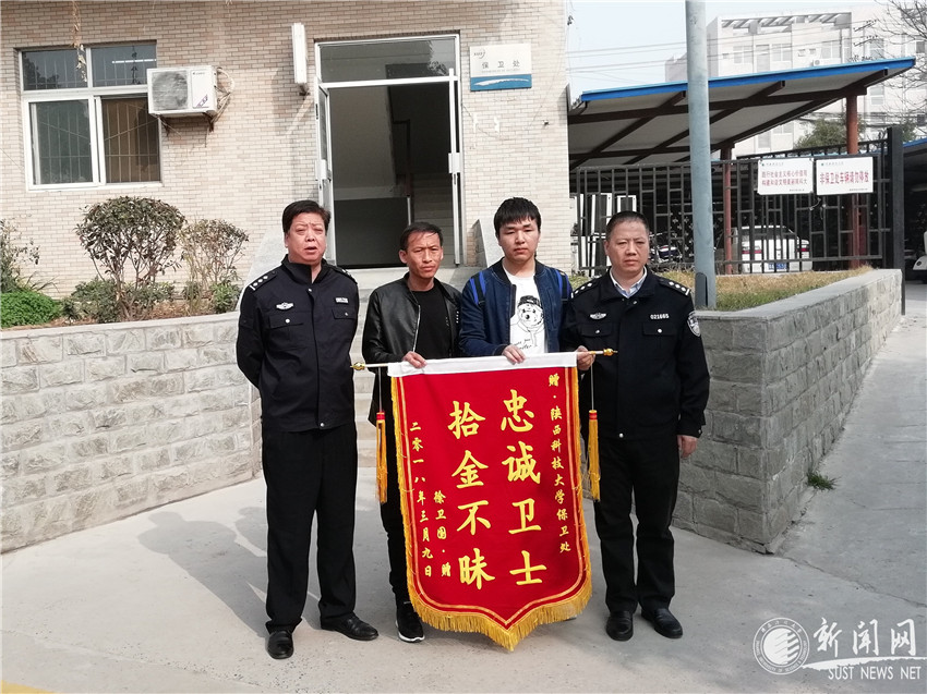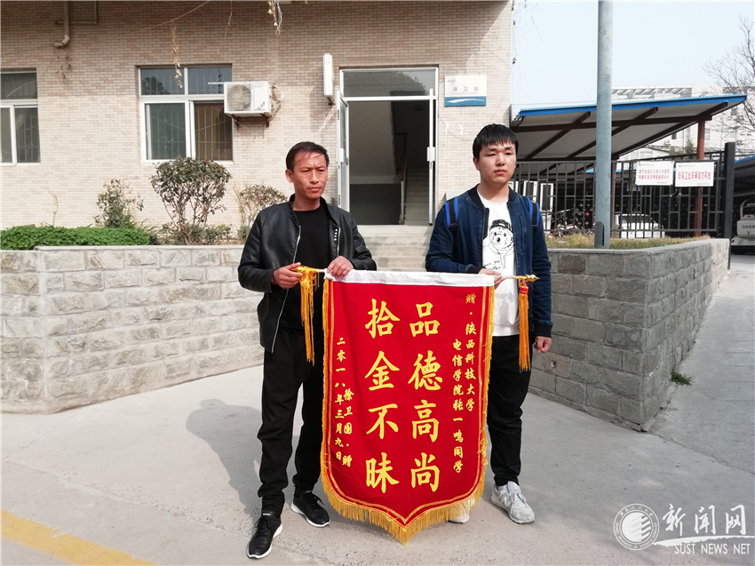 来自陕西榆林的徐卫国先生3月12日一大早就赶到陕西科技大学,分别将写有“拾金不昧,忠诚卫士”和“拾金不昧,品德高尚”的两面锦旗,郑重地送到学校保卫处、电气与信息工程学院大四学生张一鸣手中,以此表达他深深的谢意。