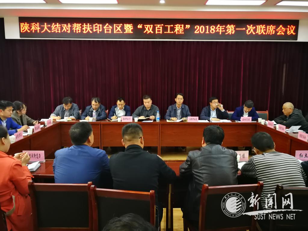 为扎实推进“双百工程”,实施精准帮扶对接,助力印台区脱贫攻坚工作。党办校办主任助理王先锋与科技处、人事处、教育学院等专家教授一行近日赴铜川市印台区参加陕西科技大学结对帮扶印台区暨“双百工程”2018年第一次联席会议。印台区高校帮扶领导小组办公室主任张根银以及印台区9个乡镇、16个区级部门的负责同志参加会议,会议由区教科体局党工委副书记杨志宏主持。