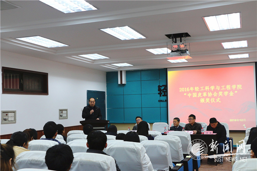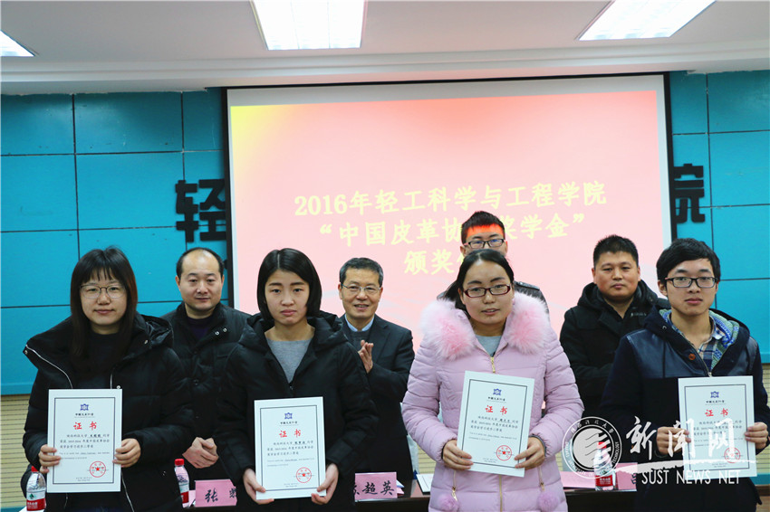 12月12日,我校“中国皮革协会奖学金”2016年颁奖仪式在实验楼1B第318号学术报告厅举行。中国皮革协会名誉理事长苏超英、轻工科学与工程学院党委副书记李晓、副院长张辉、皮革教研室主任吕斌、院长助理陈李斌出席了颁奖仪式,仪式由辅导员秦永修主持。该奖学金自1995年在我校轻工科学与工程学院设立,至今已有20余年历史。