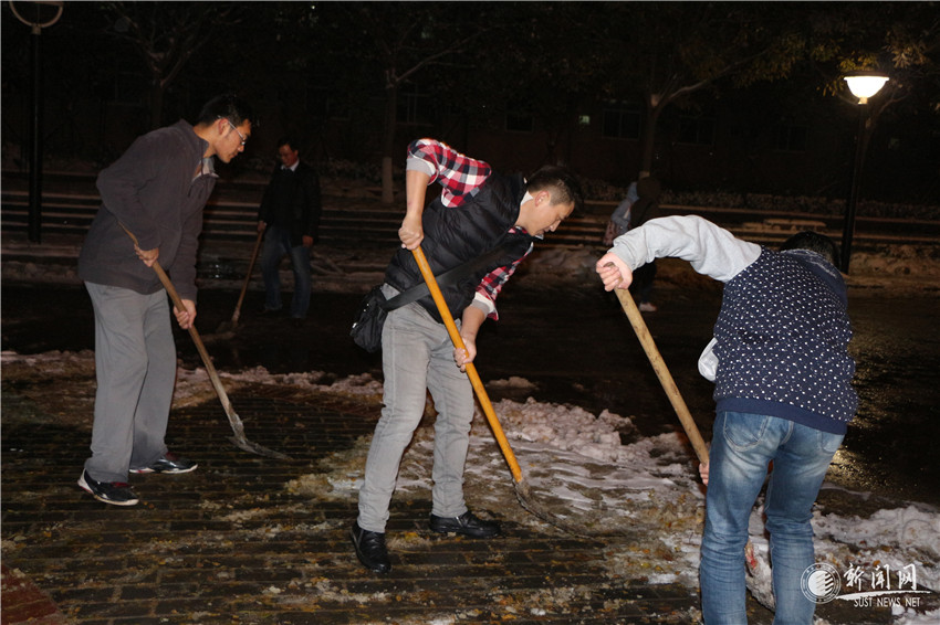 当晚,号召一经发出,学校阳光助学中心、国旗护卫队、公寓自管会、易班工作站纷纷响应,建立起爱心队伍组织铲雪行动,党委副书记温锋也亲临现场参与铲雪。冬日的雪夜寒风刺骨,志愿者们的手都冻得通红,但他们依然精神抖擞,不言辛苦,冒着严寒继续铲雪。他们的奉献之心感染了路过的学生们,纷纷加入到了扫雪除冰的队伍中。从党员到群众,从教师到学生,所有人的爱心汇聚成炽热跳跃的火焰,点亮,温暖了科大寒冷的夜。师生们齐心协力让这个雪天不再“湿滑”,切实保障了师生们的出行,保障了学校各项教学科研工作的正常进行。他们的热心构成了这个雪天校园中最美的风景。