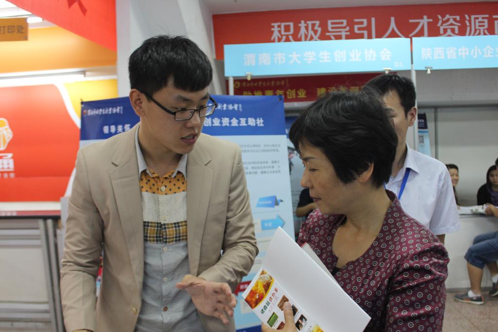 张宇(左)向陕西省人才中心副主任边放歌(右)介绍团队创业项目