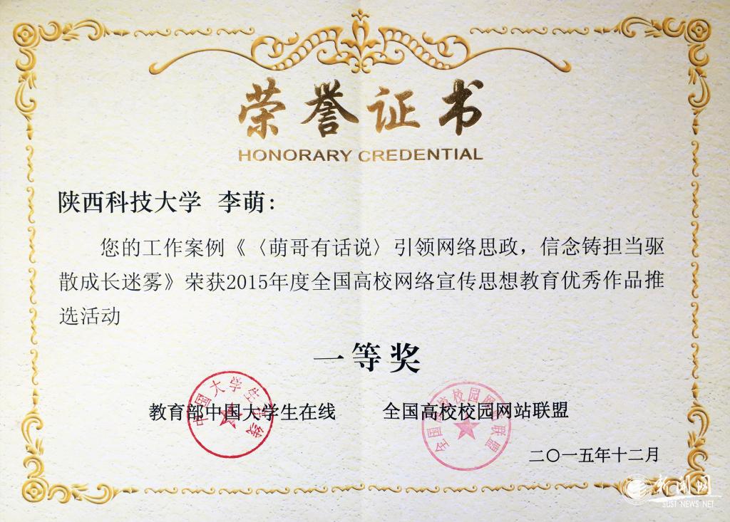2015年8月,由教育部思想政治工作司、国家互联网信息办公室网络社会工作局主办,全国高校校园网站联盟、教育部中国大学生在线承办的首届全国高校网络宣传思想教育优秀作品评选活动正式启动。我校党委宣传部结合学校宣传思想工作实际,积极做好报名推荐、审核选拔等工作,推选出《〈萌哥有话说〉引领网络思政 信念铸担当驱散成长迷雾》等作品参加评选。