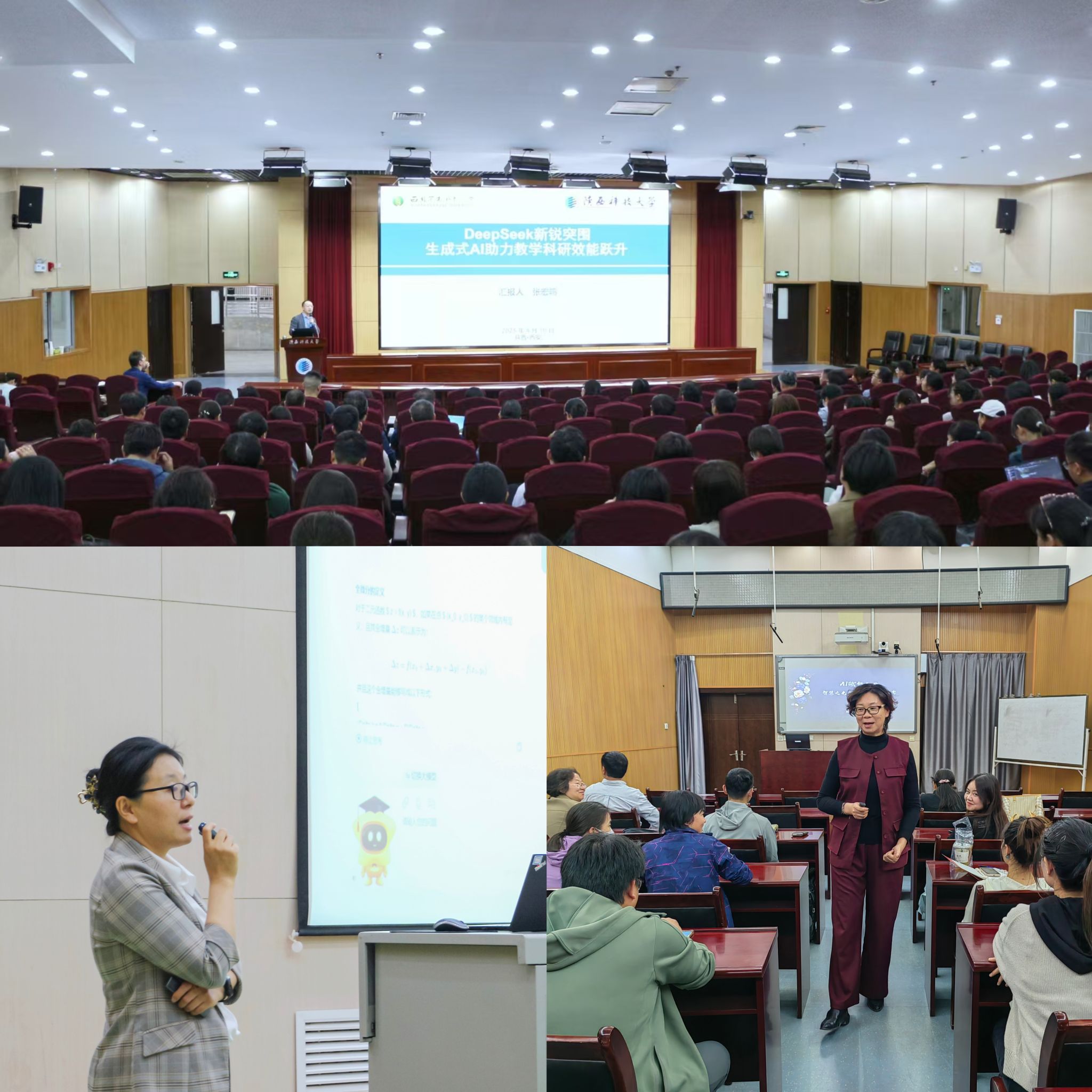 特邀省内高校专家学者为本次系列研修做专题报告,呈现人工智能与教育教学融合创新的前沿图景。西北农林科技大学张宏鸣教授以《DeepSeek新锐突围:生成式AI助力教学科研效能跃升》为题,深入剖析了生成式AI在课程设计、学术研究中的应用潜力;通过丰富案例展示了AI技术如何全方位赋能高校教师工作。西安交通大学卢晓云教授在《AI赋能教学:智慧之光与暗仞之殇的博弈》报告中,辩证探讨了AI技术带来的机遇与挑战,为教师合理运用智能工具提出了宝贵建议。西安建筑科技大学王艳教授来校作题为《AI赋能新工科课程建设与教学改革的创新实践——国家一流课持续建设经验分享》的专题报告,从新工科教育理念出发,系统分享了AI技术驱动课程改革的方法与创新实践。三场高水平报告既有理论高度又具实践深度,为参训教师开拓了智能教育创新的新视野。