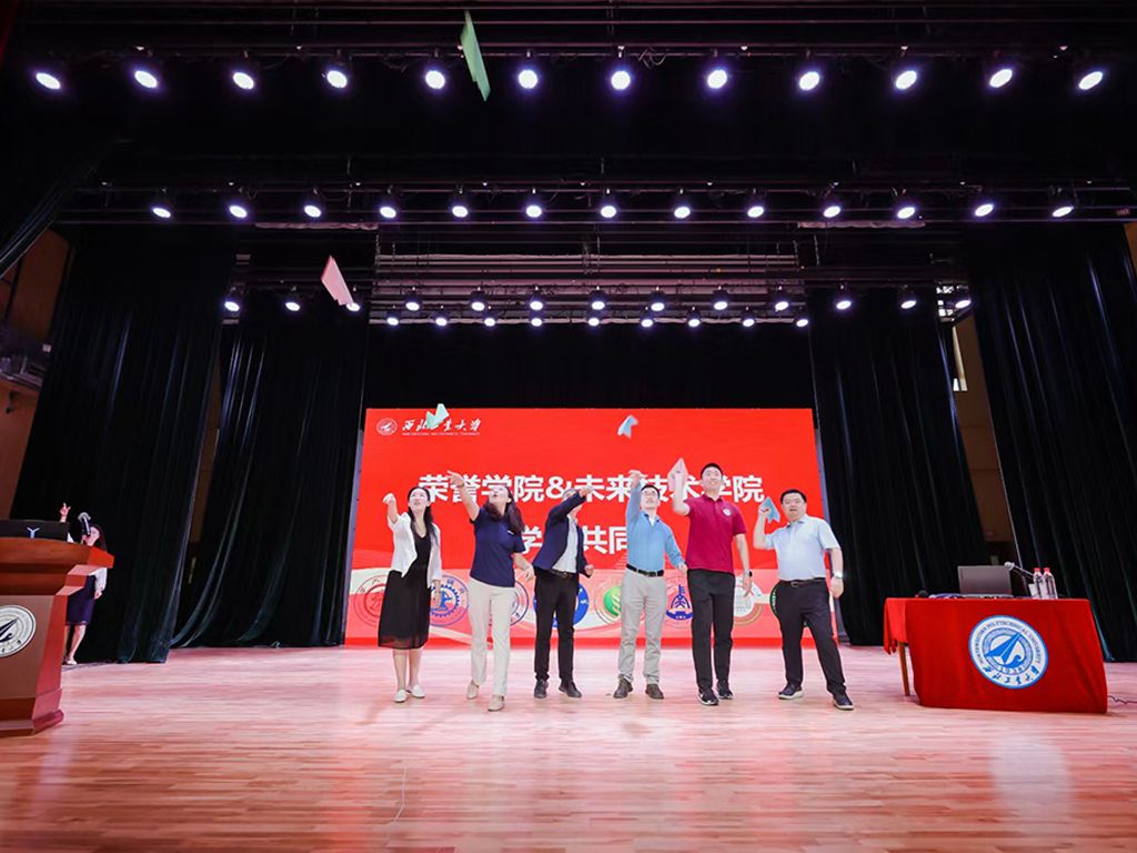 我校未来技术学院柔电本博贯通班班主任王元明老师与西北工业大学林鑫、牟蕾及兄弟高校荣誉学院、未来技术学院的领导们共同放飞纸飞机,宣布本届学生节开幕,共筑学习共同体、助力拔尖人才成长。