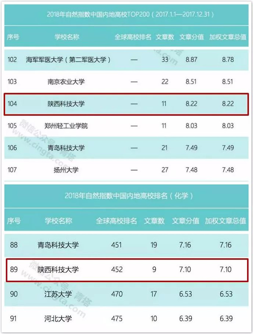 陕科大在“中国内地高校2018自然指数排行榜”中位居全国高校104名