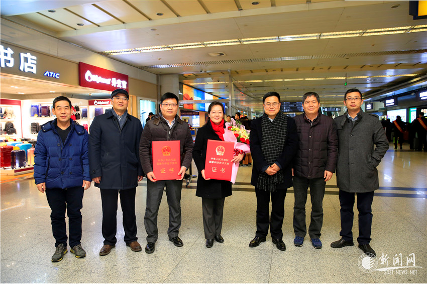 2018年1月8日,从北京人民大会堂传来喜讯——在刚刚结束的2017年度国家科学技术奖励大会上,由陕西科技大学张美云教授主持的创新性研究成果“高性能纤维纸基功能材料制备共性关键技术与应用”荣获国家科学技术进步二等奖。在京领奖期间,张美云教授受到了习近平等党和国家领导人亲切会见,并合影留念。1月9日下午,校长马建中、副校长李志健前往机场,迎接参加2017年度国家科学技术奖励大会载誉归来的张美云教授及团队成员。