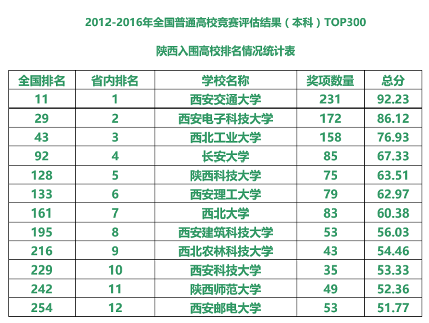 根据12月14日中国高等教育学会《高校竞赛评估与管理体系研究》专家工作组预发布《中国高校创新人才培养暨学科竞赛评估结果》,我校入围2012-2016全国普通高校竞赛评估结果(本科)“TOP300”,居省属高校第一,陕西高校排名第5,全国高校列128名。