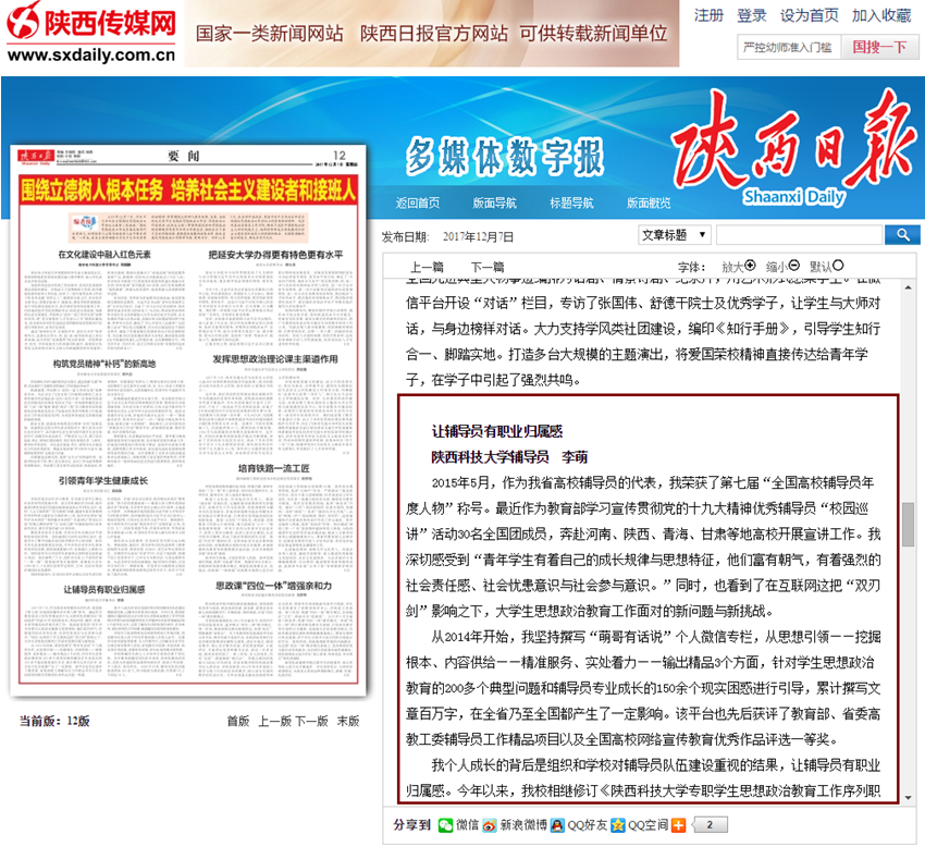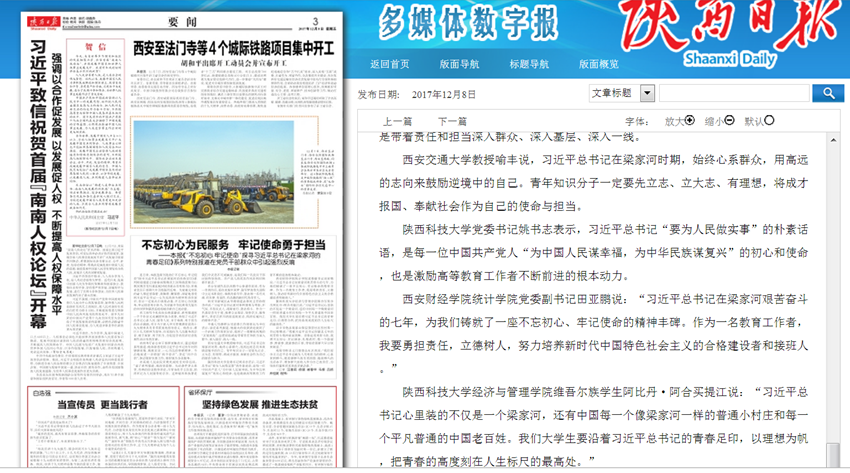 12月8日发行的《陕西日报》3版要闻刊登了《“探寻习近平总书记在梁家河的青春足印”系列特别报道引起强烈反响》,其中报道我校师生观文后从中汲取力量、不忘初心、牢记使命勇于担当的切实感悟和为实现中华民族伟大复兴的中国梦和陕西追赶超越贡献自己力量的践行意愿。