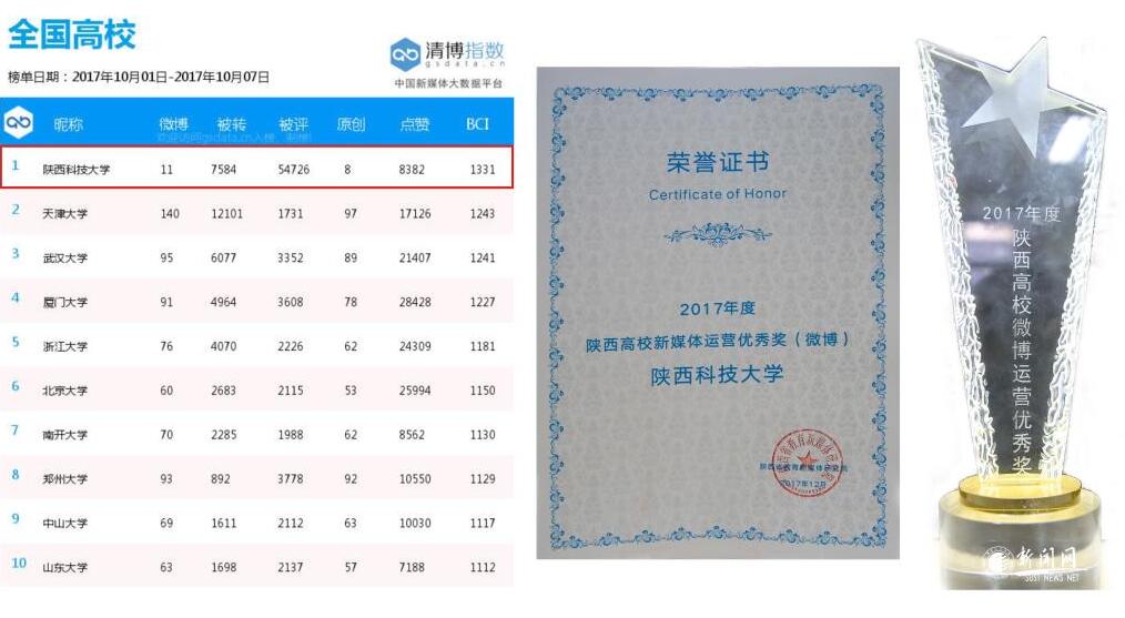 12月22日,由省委高教工委、省教育厅主办,西安欧亚学院、陕西省教育新媒体研究院承办的2017年陕西教育新媒体年会在西安欧亚学院召开。会议颁发了2017年度陕西教育新媒体运营奖项,我校获2017陕西高校微博运营优秀奖。