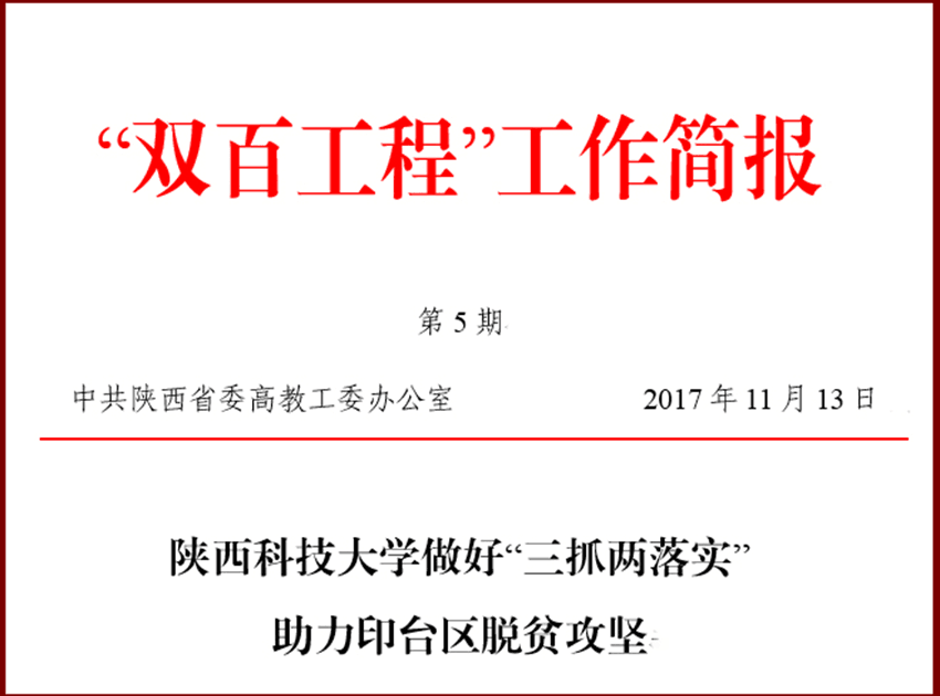 11月13日,我校题为“陕西科技大学做好‘三抓两落实’助力印台区脱贫攻坚”的通讯稿,在省委高教工委“双百工程”工作简报中进行交流。