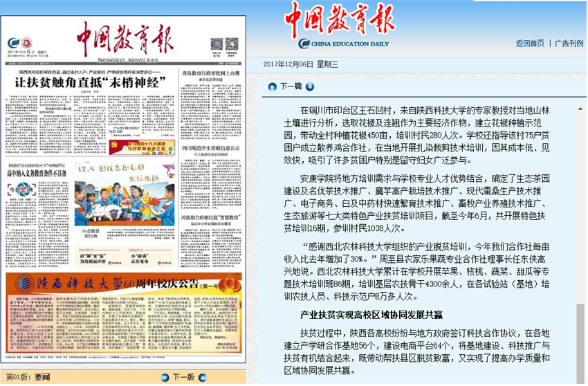 12月6日,《中国教育报》在头版头条刊发的报道《陕西百所高校帮扶百县,通过走村入户、产业培训、产学研协同开展深度扶贫——让扶贫触角直抵“末梢神经”》中,报道了我校在铜川市印台区王石凹村,通过开展多种形式的特色产业培训,增强贫困地区的“造血”功能。