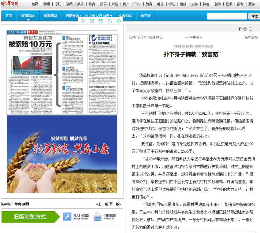 12月14日,《华商报》报道了我校驻村扶贫干部姬海锋任王石凹村驻村扶贫工作队队长兼第一书记以来——扑下身子铺就“致富路”的新闻。