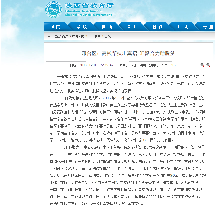 12月1日,陕西省教育厅门户网站在“教育新闻”的《印台区:高校帮扶出真招 汇聚合力助脱贫》报道中,报道了我校充分发挥人才、科技、智力等方面的优势,积极对接,迅速行动,采取多途径多方法扎实推进,助力铜川市印台区脱贫攻坚,实现校地双赢。