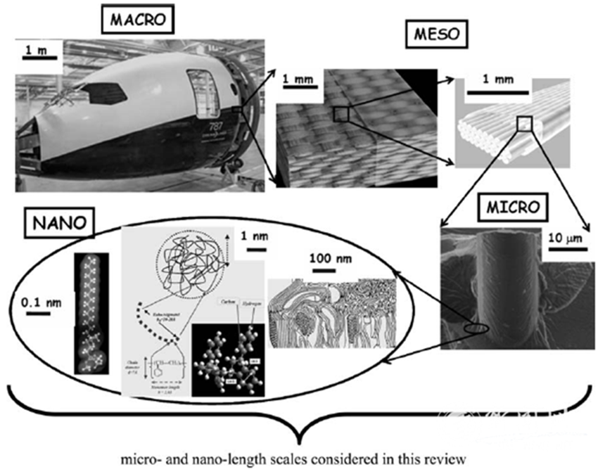图2 波音787用树脂基复合材料结构件的多尺度设计(纳观-微观-介观-宏观) [图片引自Journal of Materials Science, 2008, 43(20): 6747-6757]