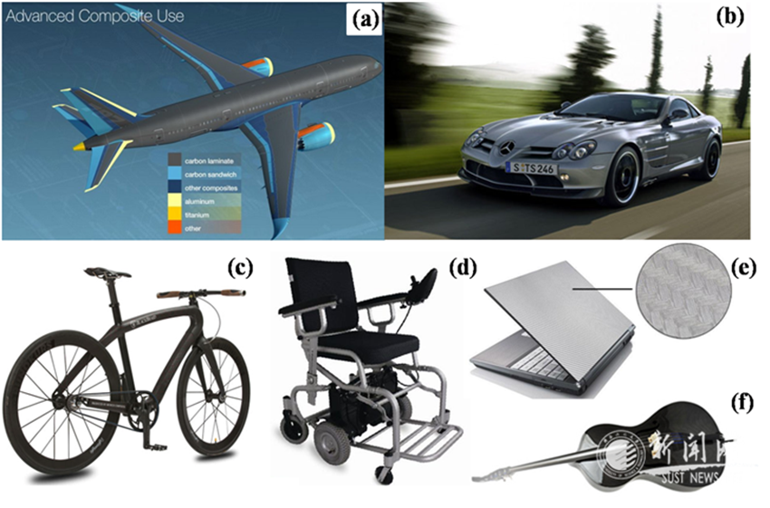 图1 碳纤维复合材料的应用:(a) 波音787, (b) 奔驰全碳纤维复合材料汽车, (c) 自行车, (d) 轮椅, (e)笔记本电脑, (f) 小提琴