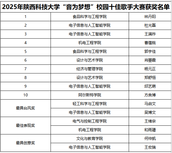 6月15日晚,校团委于校文体馆前广场举办2025年“音为梦想”校园十佳歌手大赛决赛,现场气氛热烈非凡,掌声、欢呼声交织成一曲青春的交响乐。最终,来自食品科学与工程学院2022级本科生林丹阳、电子信息与人工智能学院2023级研究生杜光磊、电子信息与人工智能学院2024级本科生王满祚分别获得本次大赛的冠亚季军。校团委书记李鹏、副书记赵闯,现场数百名师生观众观看了比赛。