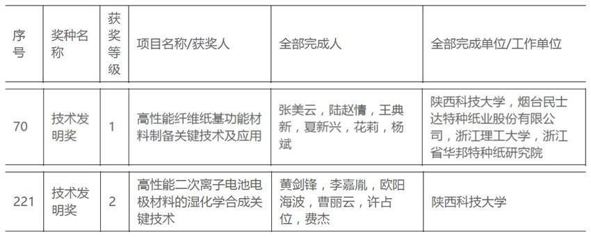 陕西省科技创新大会于9月22日在西安召开,我校5项科技成果获2015年度省科学技术奖。我校独立主持完成的4项科技成果获陕西省科学技术二等奖,与他人合作完成1项成果获陕西省科学技术奖三等奖。此次获奖成果如下:“基于高性能微晶纤维素制备的麦草高值利用技术与应用”科研成果获得陕西省科学技术奖二等奖;“中高速卫生纸机全集成自动化控制系统”科研成果获得陕西省科学技术奖二等奖;“高效厌氧好氧二级生化加芬顿氧化技术用于有机废水处理的技术推广”科研成果获得陕西省科学技术奖二等奖;“锂离子电池材料湿化学合成研究及应用”科研成果获得陕西省科学技术奖二等奖;“高性能LED线光源技术研究”科研成果获得陕西省科学技术奖三等奖。