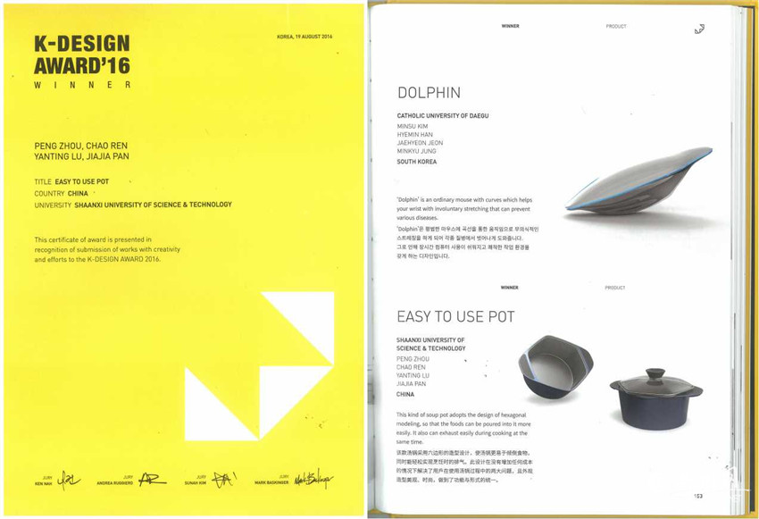 2016韩国K-DESIGN国际设计奖评奖结果于9月公布,我校设计与艺术学院2014级艺术设计研究生鲁燕婷(导师:杨晓燕)在实习单位完成的作品《EASY TO USE POT》喜获“Winner Award’2016”奖项。