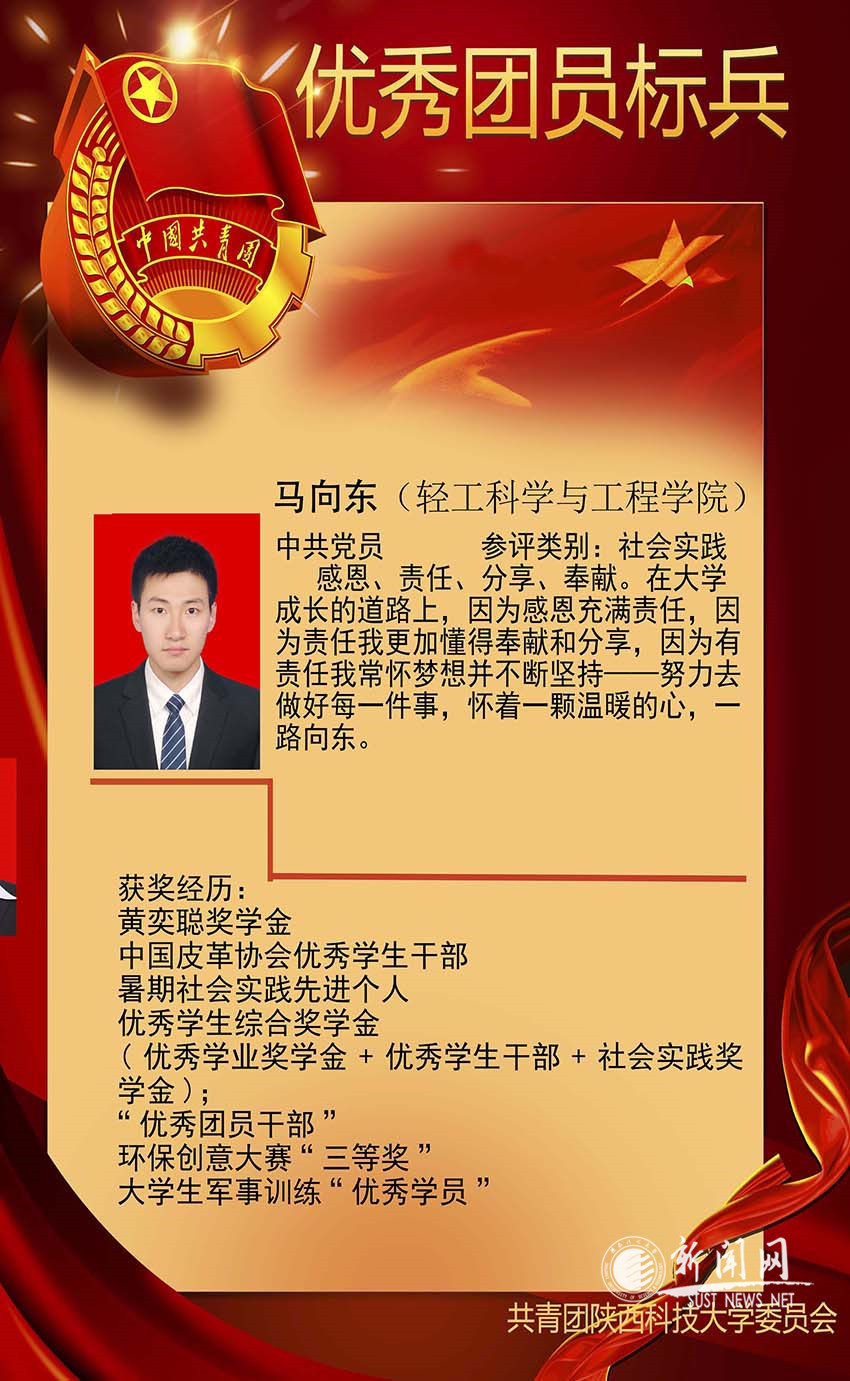 马向东,男,中共党员,陕西科技大学轻工科学与工程学院2012级非织造材料与工程专业学生,主要研究方向为合成革化学品。曾任资源与环境学院团委副书记(学生),现为陕西科技大学第十八届研究生支教团成员。