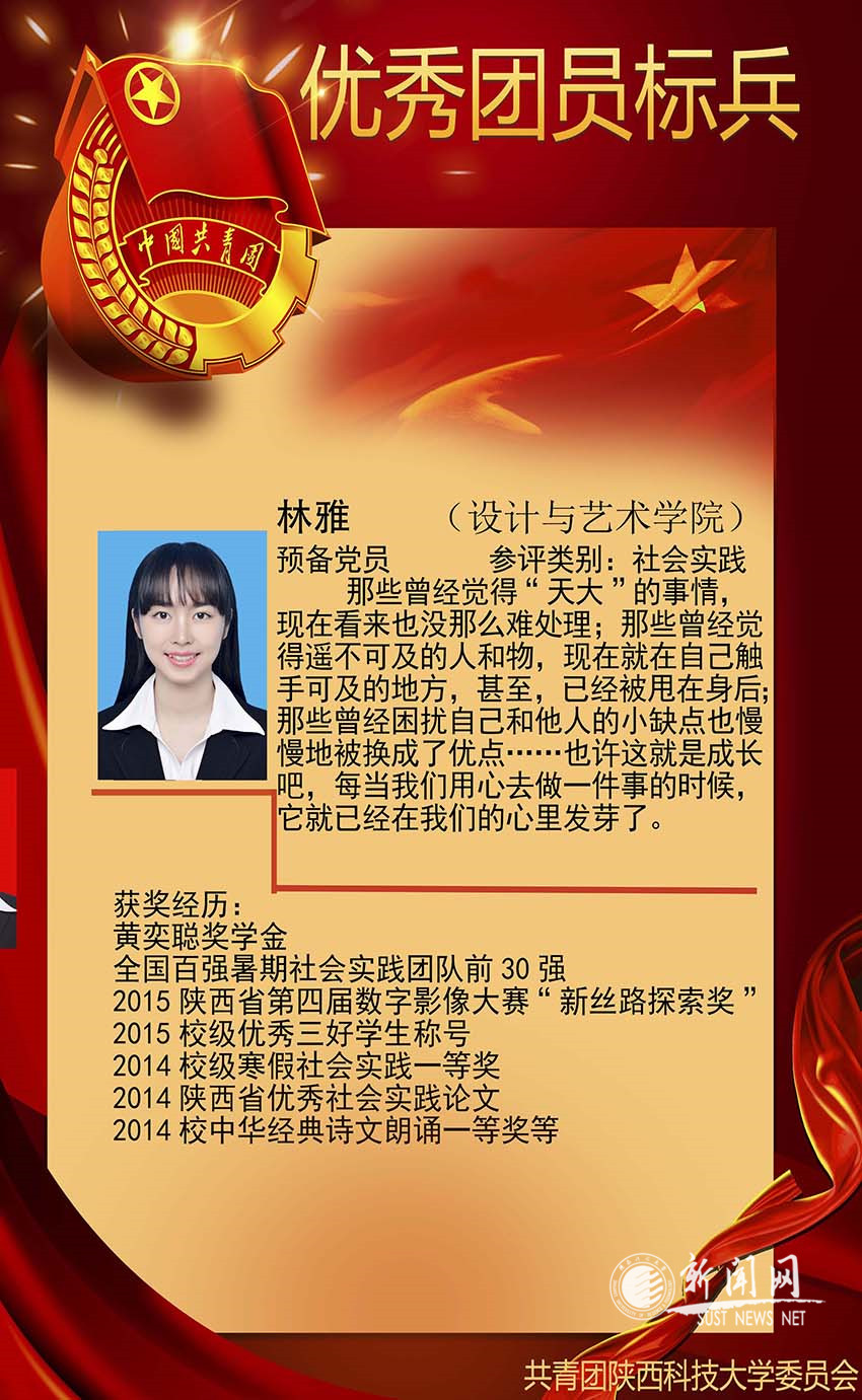 林雅,女,中共预备党员,陕西科技大学设计与艺术学院2013级播音与主持艺术专业本科在读学生。创办陕西科技大学织青公益协会、文传之声协会,2013年任文传学院辩论队队长。在校期间学习认真刻苦,积极投身社会实践、长期坚持志愿公益服务、精心组织各类校园文化活动,并取得了突出成绩,多次获得校级、省级及国家级荣誉嘉奖。