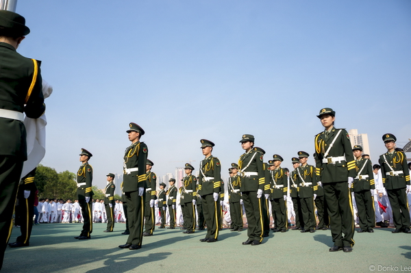 热浪席卷运动会赛场,所到阴凉之处尽是人群,唯有一支来自我校的国旗护卫队,由32名队员组成的他们,无人缺席。他们一一身着整齐的制服,将自己昂首挺胸的身姿立于烈日之下。