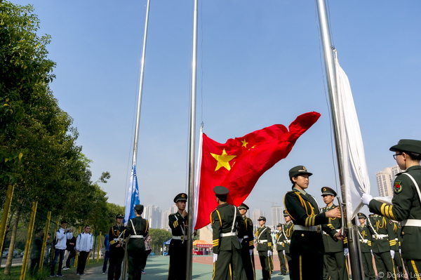 开幕式上,他们是运动方阵的开场嘉宾,是守护国旗的“校园天使”,在激扬的国歌伴奏中和同学们的集体注视下,升起手中的旗帜,一展运动雄风气息。之后,又立马化身为“最佳守门员”,严格把控外来人员进出运动会场的秩序,虽面容严肃,寡言少语,可这恰恰是他们工作态度的最真诚的彰显。