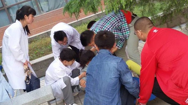 "快!快!快点啊!"一名穿着白大褂的女孩站在F座楼下焦急的呼喊着,五六个救护人员闻声跑到现场,发现一名女生匍匐在地,面色苍白。救护人员让周围围观的人群散开,其中一位医生赶忙跪在地上将该女生的身体翻转过来,立即对她实施了胸外心脏按压,一会儿之后,病人被抬上担架迅速转运到校医院进行进一步治疗。