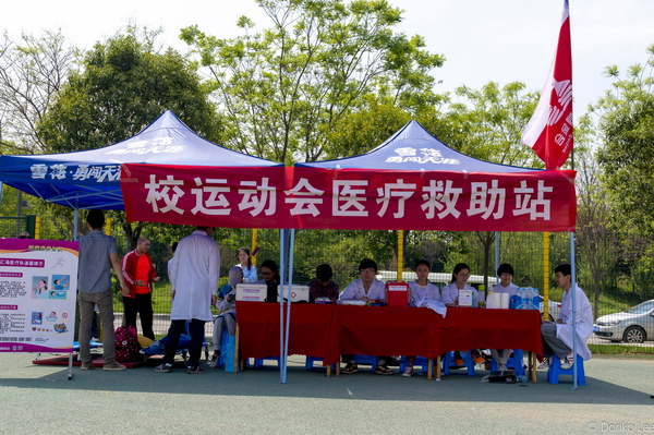 处理完这些之后,几名医护人员又赶回了热闹的运动场,这里有一个蓝色的帐篷,里面配备有氧气袋、担架和医疗救助箱等救援器材,随时准备救助赛场上受伤的运动员和观众。这是由校医院和汇海基金会联合成立的一支医疗救助队,除了一名医生和一名护士,其余的15个人都是汇海基金会的大学生志愿者。从去年开始,他们就成为运动会的驻场组织,还会不定期派人在赛场上巡逻,以便及时为师生们提供医疗救助服务。