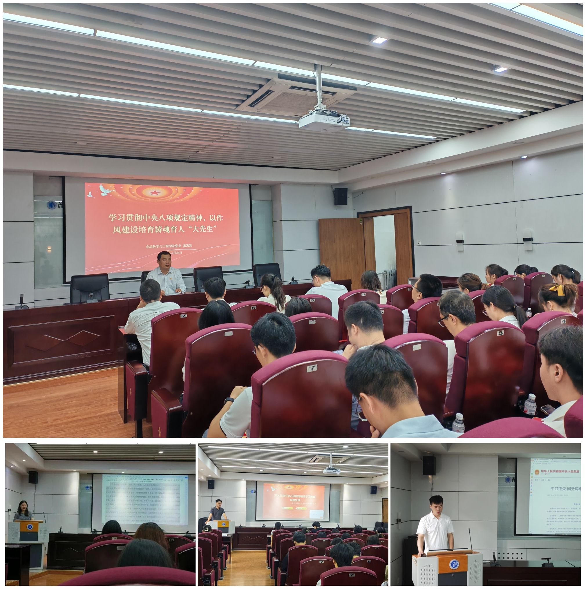 七一前夕,学院领导班子和各师生党支部书记分别讲授深入贯彻中央八项规定精神学习教育专题党课。学院党委书记张凯凯以《深入学习贯彻中央八项规定精神,以作风建设培育铸魂育人“大先生”》为题进行授课,系统阐释了教育领域践行中央八项规定精神的重要意义。学院党委委员、各师生党支部书记围绕深入贯彻中央八项规定精神学习教育心得体会,结合分管领域工作及支部特点讲授专题党课,持续推动中央八项规定精神在食品学院落地见效.
