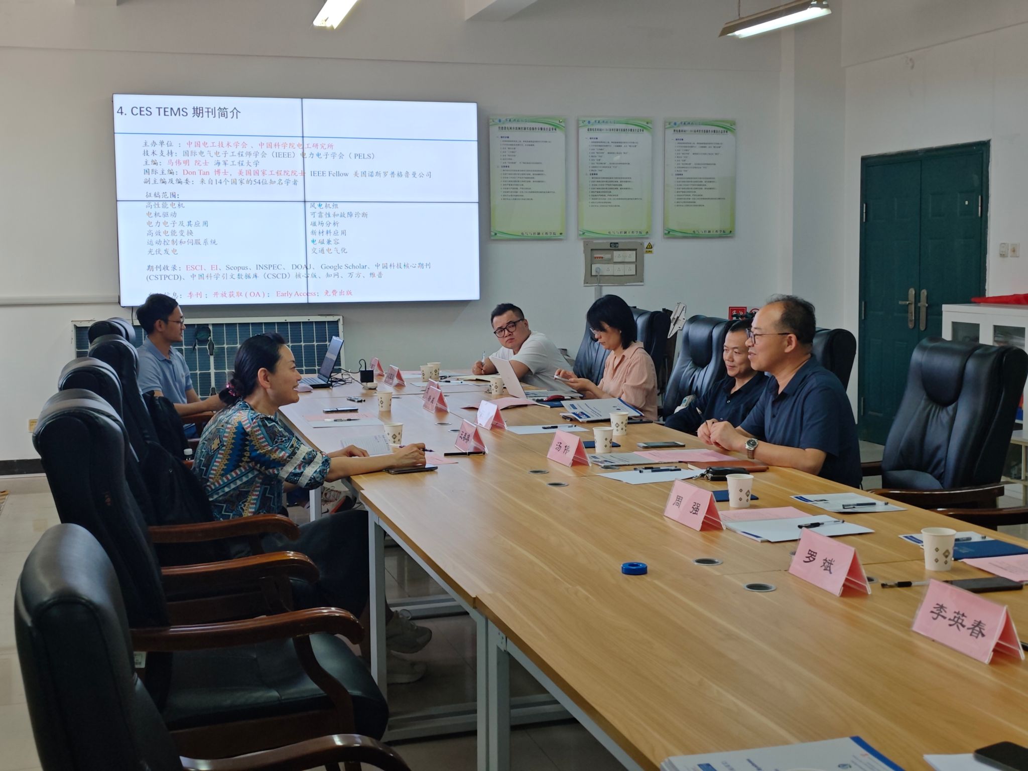 汤伟详细介绍学院发展历程、学科布局及科研特色,重点展示我校在电气工程、控制科学与工程领域的突出成果,包括“轻工业清洁生产自动化与信息化重点实验室”等省部级平台建设。石勇教授等教师介绍我校在电力电子变换器智能控制、无线电能传输技术等方面的研究进展。王春睿主任充分肯定学院的科研实力与学科特色,并系统阐述了CES TEMS的期刊定位、国际影响力(ESCI/EI收录)及发展目标,期待双方在学术传播、青年学者培养及专题组稿方面深化合作。与会教师围绕期刊投稿、学科热点及产学研融合等议题进行深入探讨。