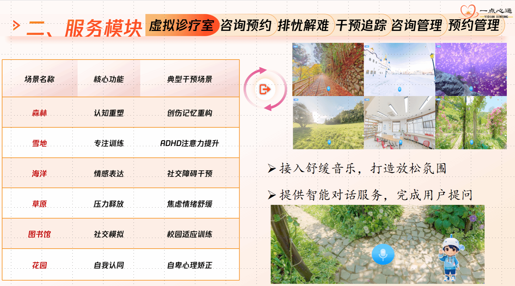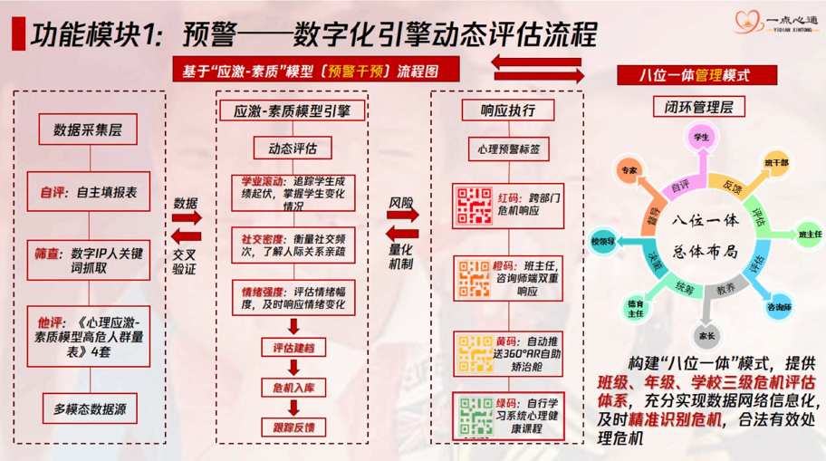 该平台通过数智技术构建了“预警-服务-教育”三级联动机制,八大角色前后衔接,协同构建心理健康教育模式闭环。在预警模块,自主研发“心理危机筛查核心引擎”,首创心理“应激-素质”评估模型,结合多模态情绪数据监测等技术,实现心理问题分层预警及动态实时赋码,解决乡村心理问题学生筛不准困境;在服务模块,通过 AR现实增强技术创设6类3D心理干预场景,打造低成本“沉浸式移动心空间”,并搭建隐秘式“排忧解难”论坛,提供专业的心理问题疏导与咨询服务,解决心理问题干预方式低数字困境;在教育模块,利用人工智能技术打造 IP 心理学伴,集成自然语言处理(NLP)技术等自动触发学伴的主动关怀机制,同时携手心理专家研发特色网络课程,通过开发项目式课程、案例式课程、游戏式课程,解决心理健康教育缺师资困境,实现心理问题从精准预警到科学干预、从教育培训到心理素养提升的全流程服务。“一点心通”数字化教育平台以中小学生为核心服务群体,通过教师、家长、班主任、德育主任询师及教育行政部门等八位一体布局,共同扩大“一点心通”平台使用范围,形成中小学心理健康服务体系。