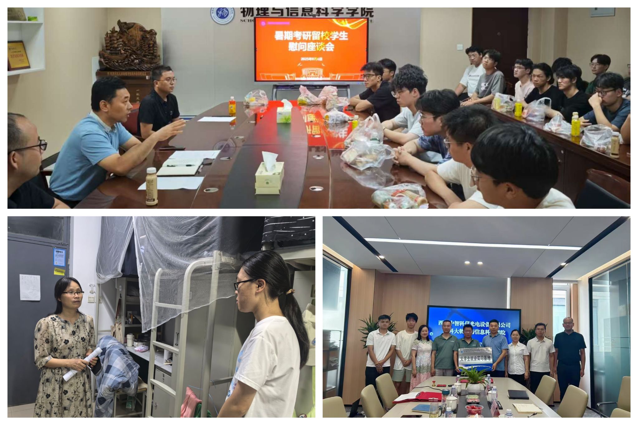 聚焦学生需求,延伸育人“服务链”。针对暑期考研学生复习场地紧张的问题,学院积极协调实验室、会议室等空间开辟为考研自习室,并配备桌椅、饮用水、网络等基础物资,为学生提供安静便捷的学习环境。假期中段,学院专门召开“暑期考研留校学生慰问座谈会”,院领导、系主任及辅导员与学生亲切交流,倾听备考困惑与需求,既为大家加油鼓劲,也送上贴心慰问品,让学生在专注复习时更能感受到学院的温暖。同时,学院专程前往中智科仪等企业,看望慰问暑期在企实习学生,实地了解他们的实习环境与实际需求,为学生实习实践全程保驾护航。