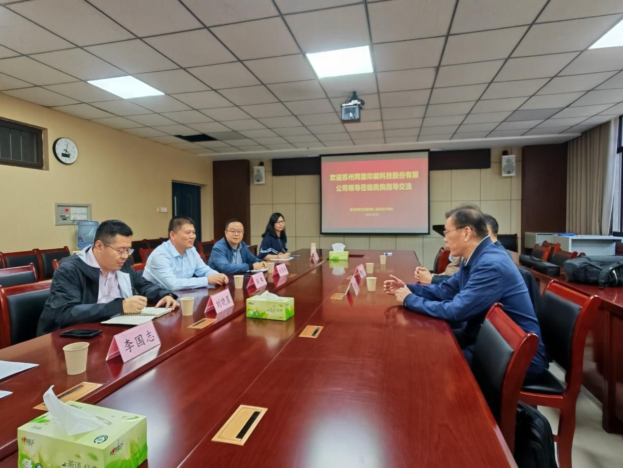 9月25日苏州同里印刷科技股份有限公司董事长严建中一行到轻工科学与工程学院就智能印刷包装材料开发和印包企业高层次领军人才的培养等问题进行调研交流。院长吕斌及新媒体系三位副系主任参加本次座谈,会议由副院长刘国栋主持。
