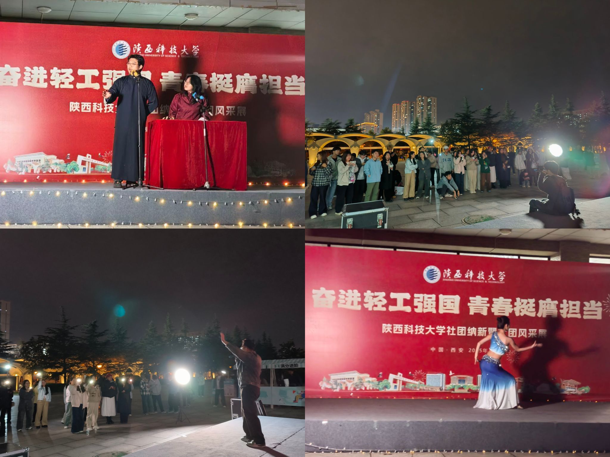 活动现场,各社团精心布置招新展位,设置了趣味互动游戏、打卡点及体验区,有效提升了同学们的参与感和体验度。现场气氛热烈,同学们纷纷驻足,深入了解各社团的特色与活动内容。17日晚,社团风采展演在教学区文体馆前精彩上演,歌曲、舞蹈、相声等节目轮番登场,引得师生驻足观看,充分展现了学生社团的活力与创意,营造了浓厚的校园文化氛围。