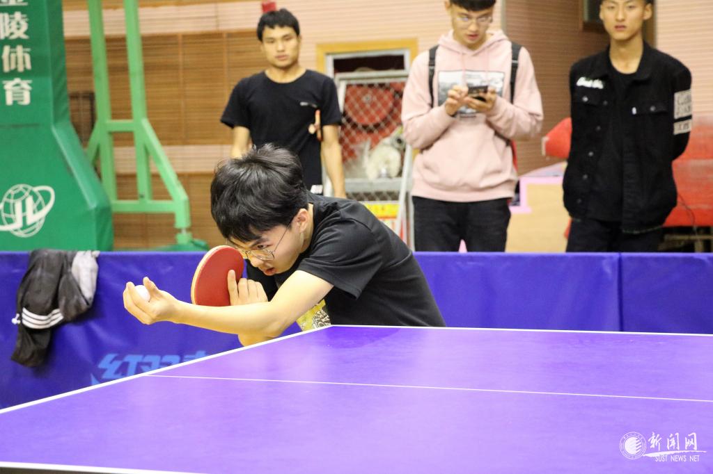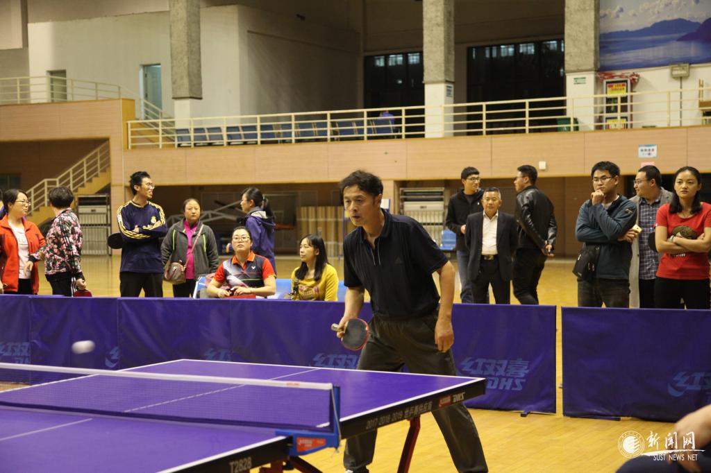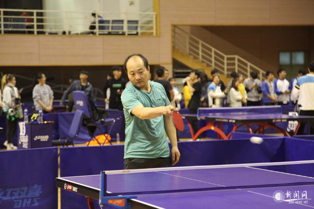 教工男子团队比赛最吸人眼球,远远地就能听见观众们的喝彩声,文理学院吴云天老师每年都参赛,属于中年组“健将级”选手,只见他拿出专业水平,每打一球,就会在台上搓一下手,拍一下球台,防止手汗影响发挥。