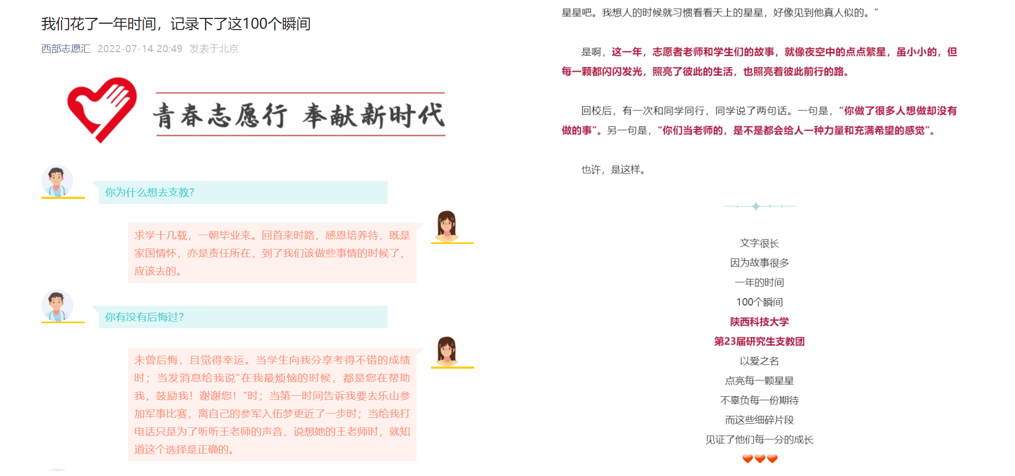 近日,全国西部计划项目办“西部志愿汇”报道了我校第22届研究生支教团王婉妮花一年时间记录的支教生活中的100个瞬间。